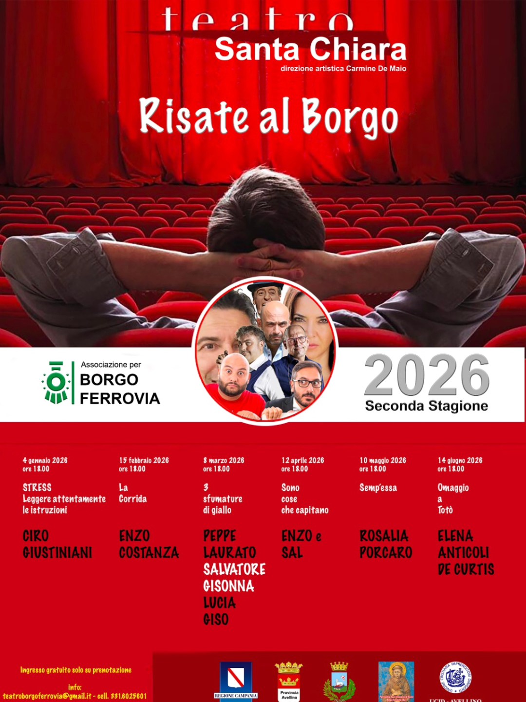 La direzione artistica della stagione è affidata a Carmine De Maio, mentre l’organizzazione è curata dall’Associazione per Borgo Ferrovia. Il cartellone prevede sei appuntamenti, da gennaio a giugno 2026, tutti di domenica alle ore 18.00. Protagonisti saranno volti noti e amatissimi dal pubblico: Ciro Giustiniani, Enzo Costanza, Peppe Laurato, Enzo e Sal, Rosalia Porcaro, fino all’emozionante Omaggio a Totò con Elena Anticoli De Curtis, dedicato al grande artista che ha fatto la storia del teatro e del cinema italiano.