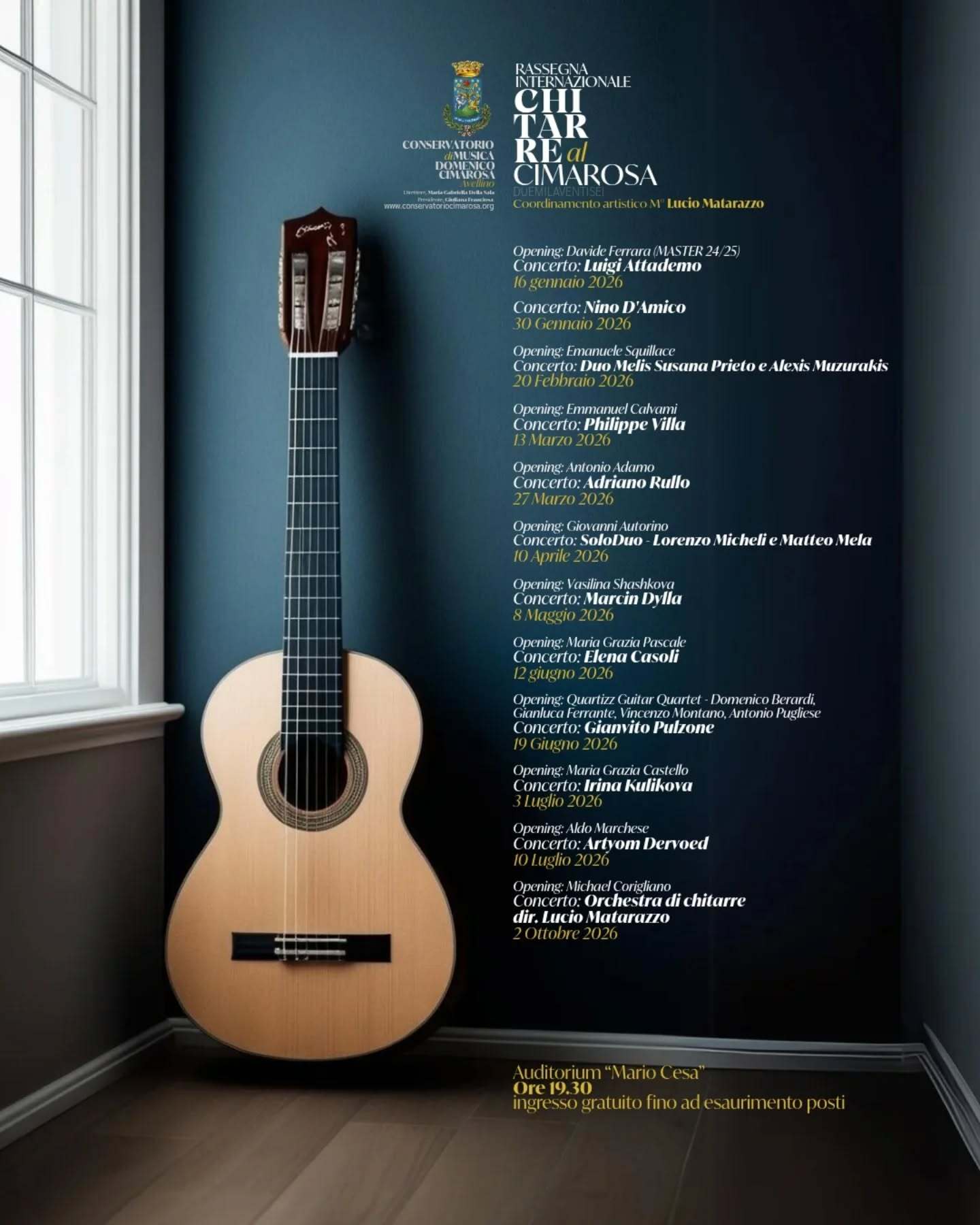 Il Conservatorio di Musica “Domenico Cimarosa” di Avellino presenta la Rassegna Internazionale “Chitarre al Cimarosa”, un un ricco calendario concertistico che, da gennaio a ottobre 2026, celebra la chitarra classica nelle sue molteplici espressioni artistiche. Sotto il coordinamento artistico del M° Lucio Matarazzo, la rassegna si conferma come uno degli appuntamenti più rilevanti per un pubblico appassionato e tra scuole, linguaggi e sensibilità diverse.